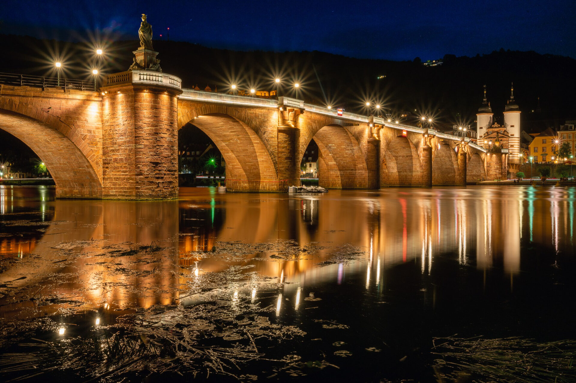 Die Karl-Theodor-Brücke, besser bekannt als Alte Brücke, verbindet seit dem 18. Jahrhundert die Altstadt mit dem Stadtteil Neuenheim. Sie wurde im 18. Jahrhundert unter Kurfürst Karl Theodor errichtet und beeindruckt bis heute durch ihre elegante Sandsteinarchitektur. Besonders bekannt ist die Brücke für ihre Brückenheiligen und die steinerne Affenskulptur, die als beliebtes Fotomotiv dient. Von hier aus eröffnet sich ein malerischer Blick auf den Neckar, das Schloss und die umliegenden Hügel. Die Alte Brücke ist nicht nur ein historisches Bauwerk, sondern auch eines der meistfotografierten Motive Heidelbergs und ein beliebter Ausgangspunkt für Spaziergänge durch die historische Altstadt.